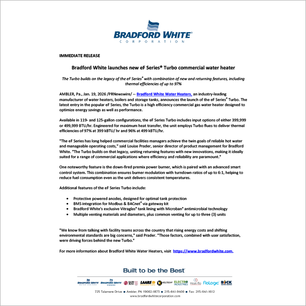 Bradford White launches new eF Series® Turbo commercial water heater