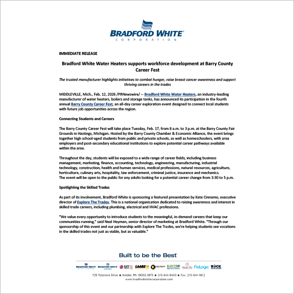 Bradford White Water Heaters has announced its participation in the fourth annual Barry County Career Fest, an all-day career exploration event designed to connect local students with future job opportunities across the region. […]